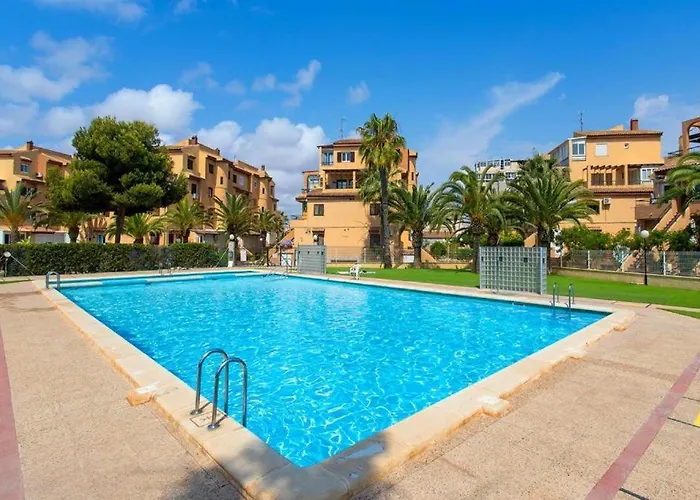 Under The Palm Trees公寓俯瞰着花园,仅需6分钟即可到达托雷维耶哈的Torremarina Mall. 除了1间卧室外,它还设有1间浴室和小厨房.